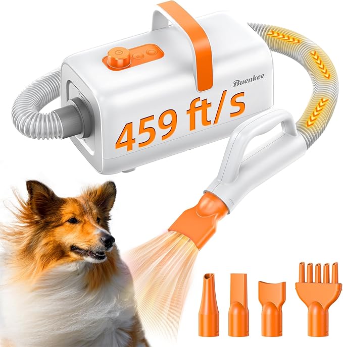 - πΎDry Your Dog in 8 Minutes: The BUENKEE dog hair dryer is equipped with a revolutionary power core that blasts air at an astonishing speed of 459 ft/s (140 m/s). It can dry a full-grown French Bulldog in just 8 minutes, making it 60% faster than other dog blow dryer. With a temperature range adjustable from a comfortable 110Β°F to a warm 140Β°F, it provides the perfect drying experience whether your furry friend just had a bubbly bath or braved a rainy day. Bid farewell to long, tiresome drying sessions and say hello to a world where your pet stays healthy and you reclaim those precious minutes for more tail-wagging fun!